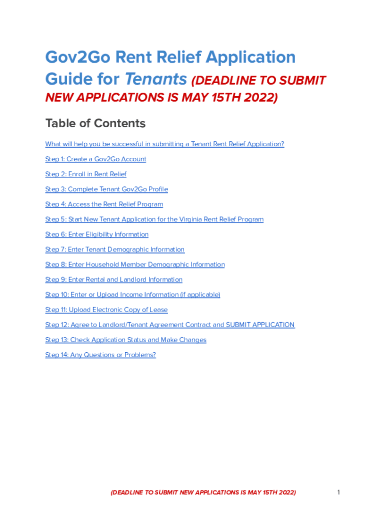 Gov2Go Rent Relief Application Guide for Tenants (DEADLINE TO SUBMIT NEW APPLICATIONS IS MAY 15TH 2022) Table of Contents What will help you be successful in submitting a Tenant Rent Relief Application?