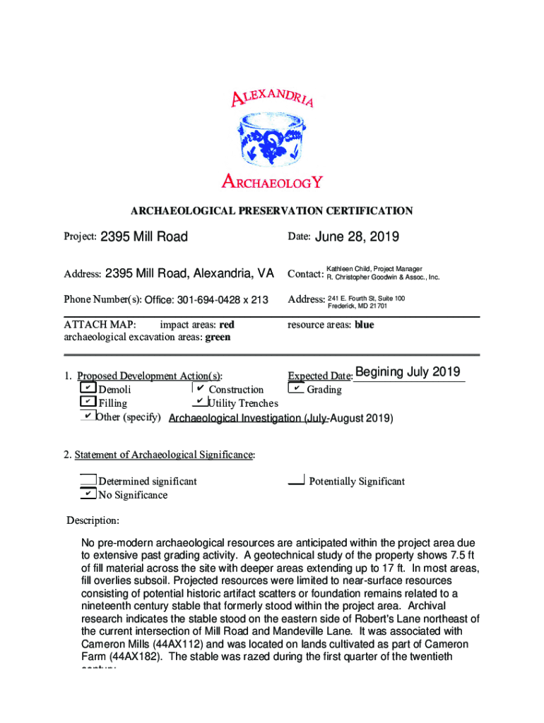 DRAFT REPORTDECEMBER 2, 2019ARCHAEOLOGICAL EVALUATION OF 2395 MILL ROAD ALEXANDRIA, VIRGINIAPREPARED FOR:LYNCH DEVELOPMENT ADVISORS, LLC 1400 16TH ST, NW, SUITE 430 WASHINGTON, D.C. 20036R. CHRISTOPHER