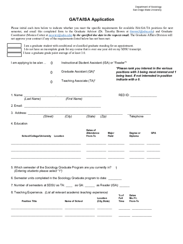 Get the free GA/TA/ISA Application Form - sociology sdsu
