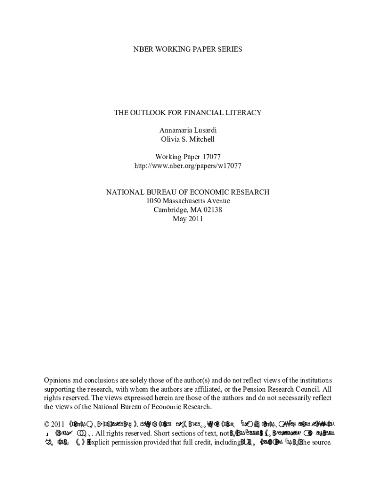 BER WORKING PAPER SERIES OUTLOOK FOR FINANCIAL LITERACY Annamaria Guard Olivia S. Mitchell Working Paper 17077 http://www.nber.org/papers/w17077 NATIONAL BUREAU OF ECONOMIC RESEARCH 1050 Massachusetts