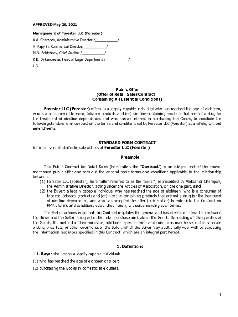 APPROVED May 20, 2021, Management of Forester LLC (Forester) A.A. Chariot, Administrative Director /___/ V. Papyri, Commercial Director/___/ M.N. Baktybaev, Chief Auditor /___/ K.B. Dyikanbaeva, Head