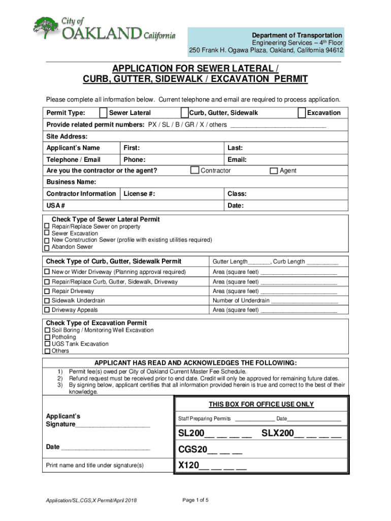 M Department of Transportation Engineering Services 4th Floor 250 Frank H. Ottawa Plaza, Oakland, California 94612___APPLICATION FOR SEWER LATERAL / CURB, GUTTER, SIDEWALK / EXCAVATION PERMIT Please