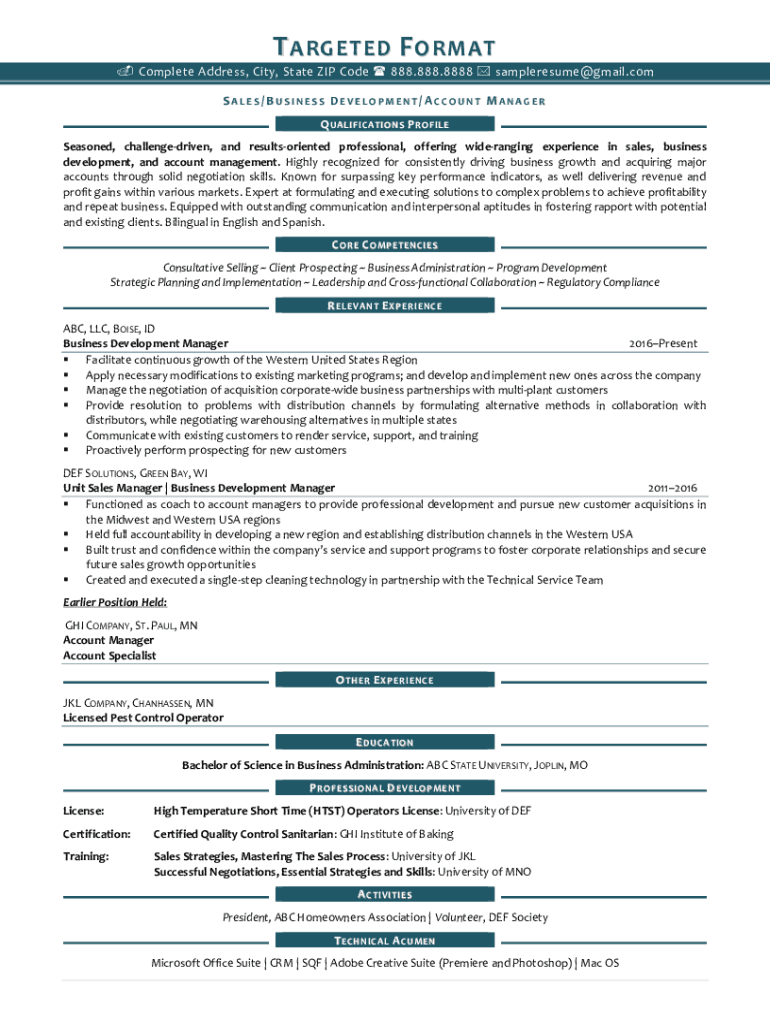 TARGETED FORMAT Complete Address, City, State ZIP Code 888.888.8888 sampleresume@gmail.com SALES/BUSINESS DEVELOPMENT/ACCOUNT MANAGER EQUAL IFI CATIONS PR OIL E Seasoned, challenge driven, and results