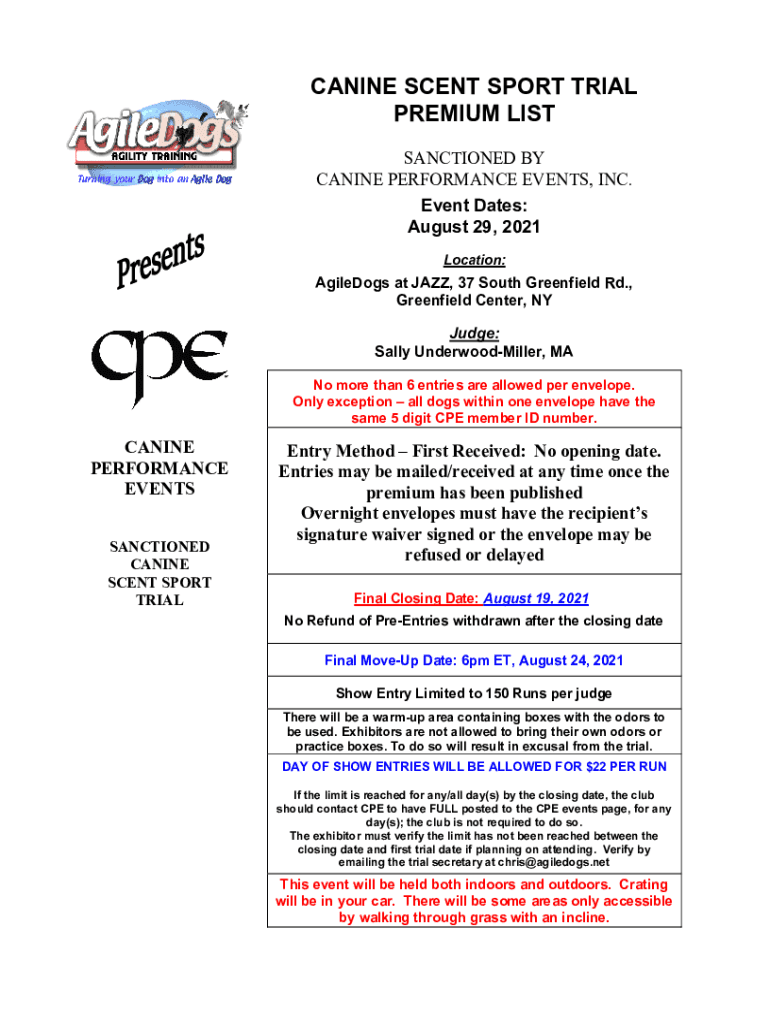 CANINE SCENT SPORT TRIAL PREMIUM LIST SANCTIONED BY CANINE PERFORMANCE EVENTS, INC. Event Dates: August 29, 2021, Location:Ailerons at JAZZ, 37 South Greenfield Rd., Greenfield Center, NY Judge: Sally