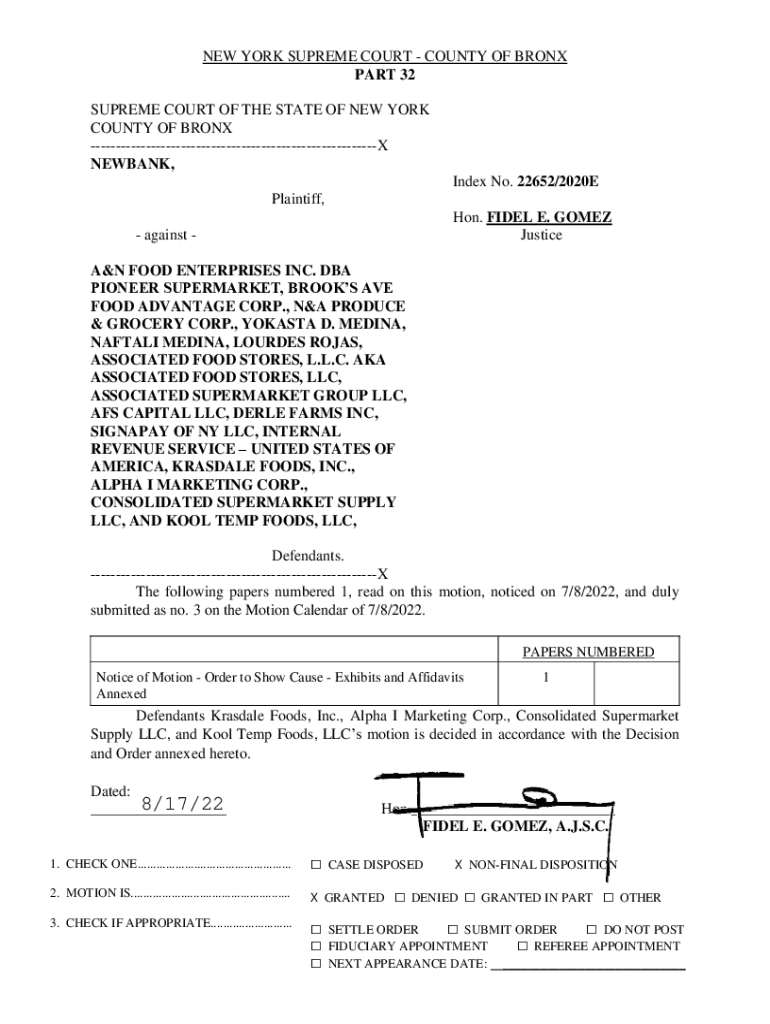 NEW YORK SUPREME COURT COUNTY OF BRONX PART 32 SUPREME COURT OF THE STATE OF NEW YORK COUNTY OF BRONX X NEWARK, Index No. 22652/2020E Plaintiff, Hon. FIDEL E. GOMEZ Justice against A&N FOOD ENTERPRISES