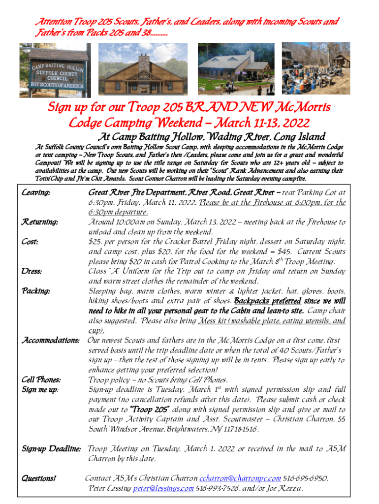 Attention Troop 205 Scouts, Fathers, and Leaders, along with incoming Scouts and Fathers from Packs 205 and 38. Sign up for our Troop 205 BRAND NEW Morris Lodge Camping Weekend March 1113, 2022 At