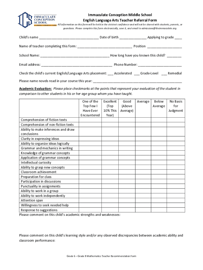 Immaculate Conception Middle School English Language Arts Teacher Referral Formal information on this form will be held in the strictest confidence and will not be shared with students, parents, or