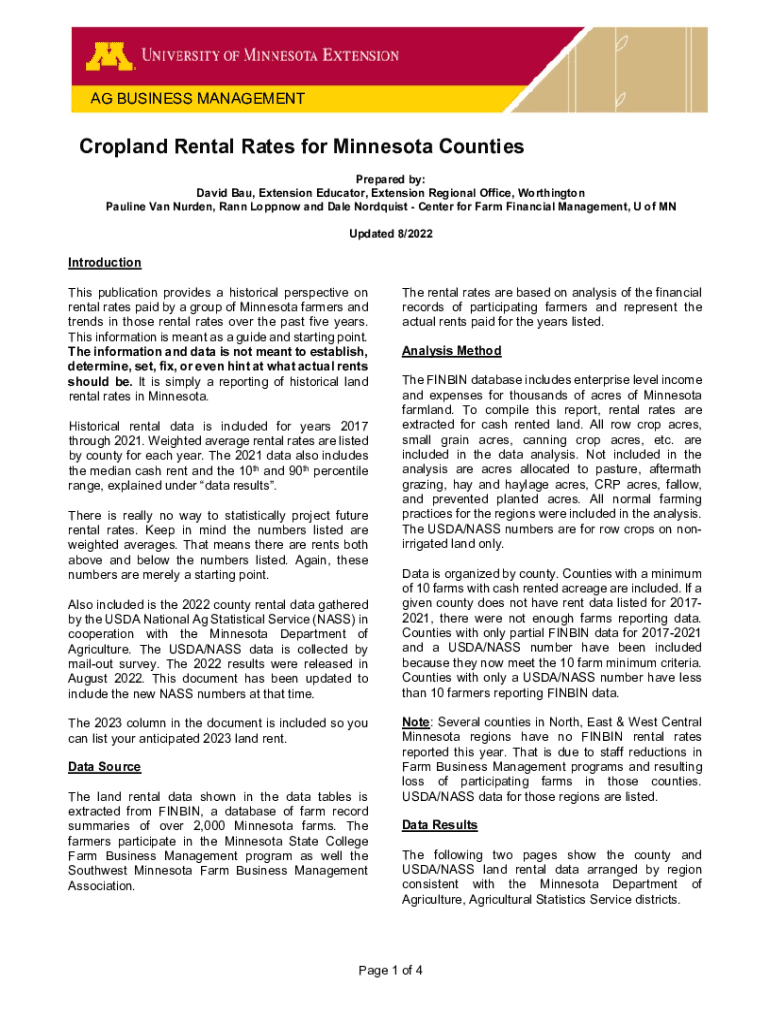 AG BUSINESS MANAGEMENTCropland Rental Rates for Minnesota Counties Prepared by: David BAU, Extension Educator, Extension Regional Office, Worthington Pauline Van Burden, Ran Lucknow and Dale Lundquist