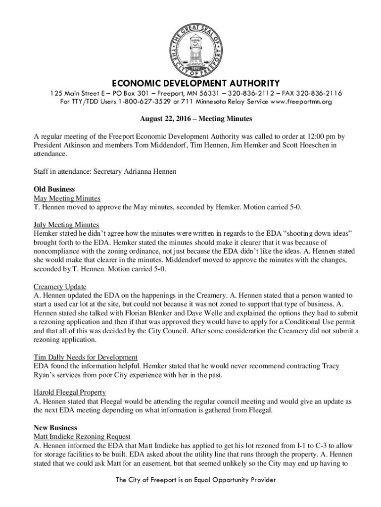 ECONOMIC DEVELOPMENT AUTHORITY 125 Main Street E PO Box 301 Freeport, MN 56331 3208362112 FAX 3208362116 For TTY/TDD Users 18006273529 or 711 Minnesota Relay Service www.freeportmn.org August 22,