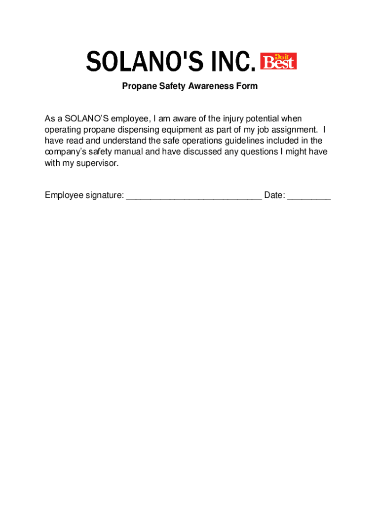 Propane Safety Awareness Format a SOLANO employee, I am aware of the injury potential when operating propane dispensing equipment as part of my job assignment. I have read and understand the safe