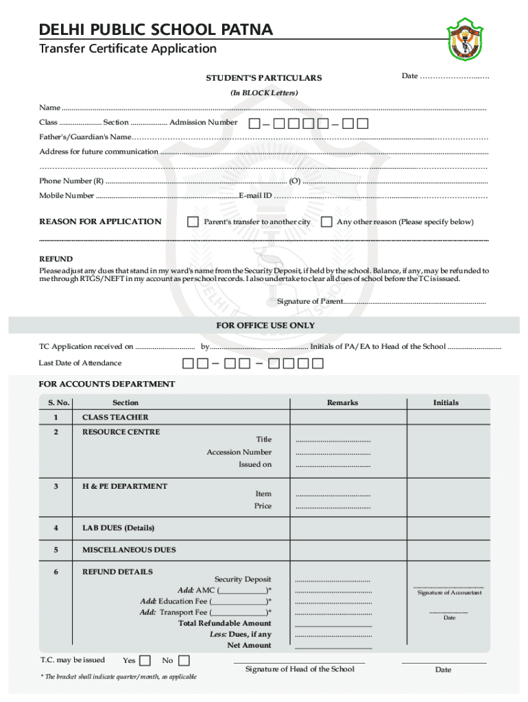 DELHI PUBLIC SCHOOL PATNA Transfer Certificate Application Date ....STUDENT\'S PARTICULARS (In BLOCK Letters)Name ............................................................................................................................................................................................................................