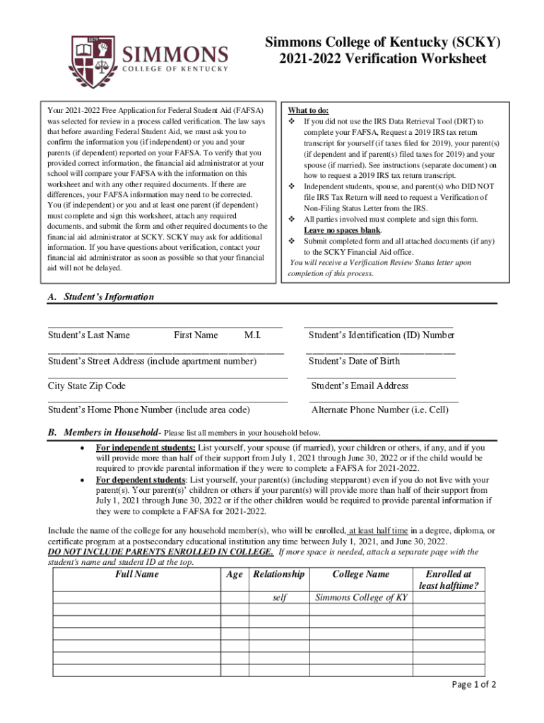 Simmons College of Kentucky (SKY) 20212022 Verification WorksheetYour 20212022 Free Application for Federal Student Aid (FAFSA) was selected for review in a process called verification. The law says