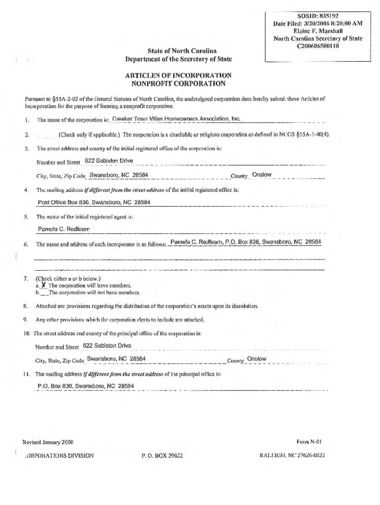 SOLID: 835192 Date Filed: 3/20/2006 8:20:00 AM Elaine F. Marshall North Carolina Secretary of State C200606500118State of North Cal\'Molina Department of the Secretary of State ARTICLES OF INCORPORATION