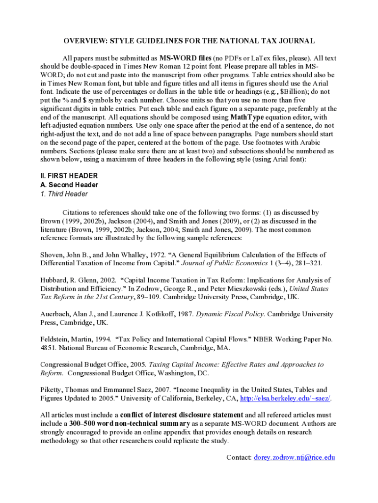 OVERVIEW: STYLE GUIDELINES FOR THE NATIONAL TAX JOURNAL All papers must be submitted as SWORD files (no PDFs or Latex files, please). All text should be double-spaced in Times New Roman 12 point font.