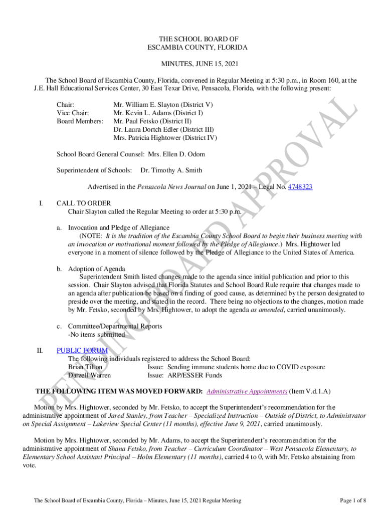 The School Board of Escambia County, Florida, convened in Regular Meeting at 5:30 p.m., in Room 160, at the