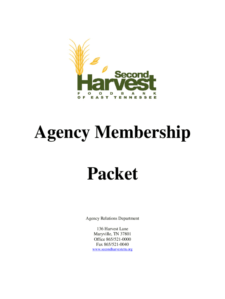 Agency Membership Packet Agency Relations Department 136 Harvest Lane Maryville, TN 37801 Office 865/5210000 Fax 865/5210040 www.secondharvestetn.orgCRITERIA FOR MEMBER AGENCIES 1. Operation Food