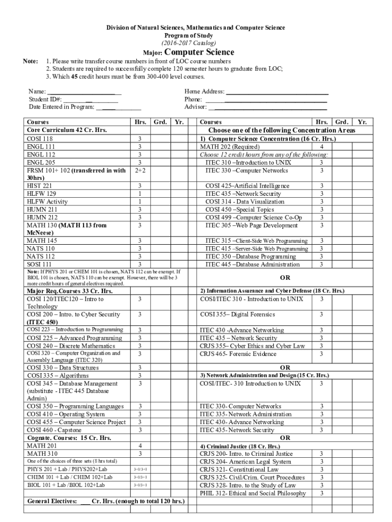 Division of Natural Sciences, Mathematics and Computer Science Program of Study (20162017 Catalog) Note:Major: Computer Science 1. Please write transfer course numbers in front of LOC course numbers