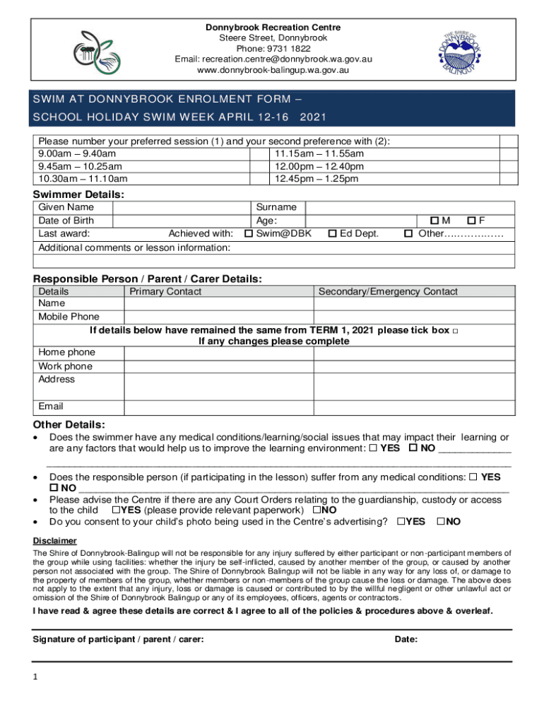 Donnybrook Recreation Center Steam Street, Donnybrook Phone: 9731 1822 Email: recreation.centre@donnybrook.wa.gov.au www.donnybrookbalingup.wa.gov.auSWIM AT DONNYBROOK Enrollment FORM SCHOOL HOLIDAY