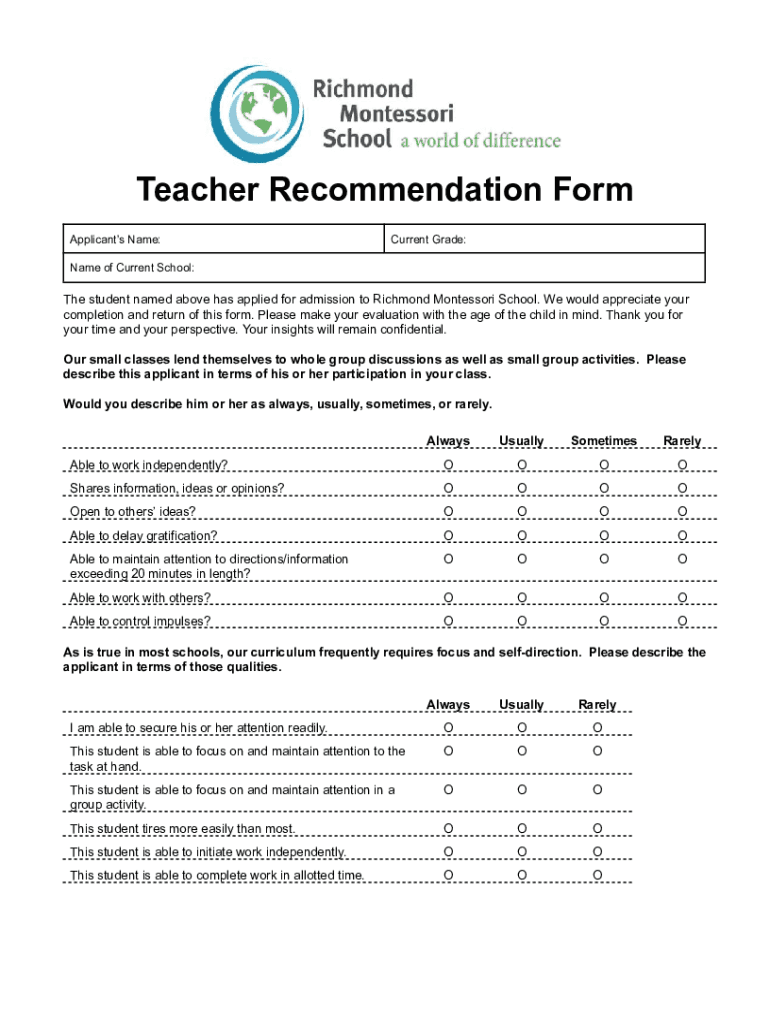 Get the free Teacher Recommendation Form - Richmond Montessori School