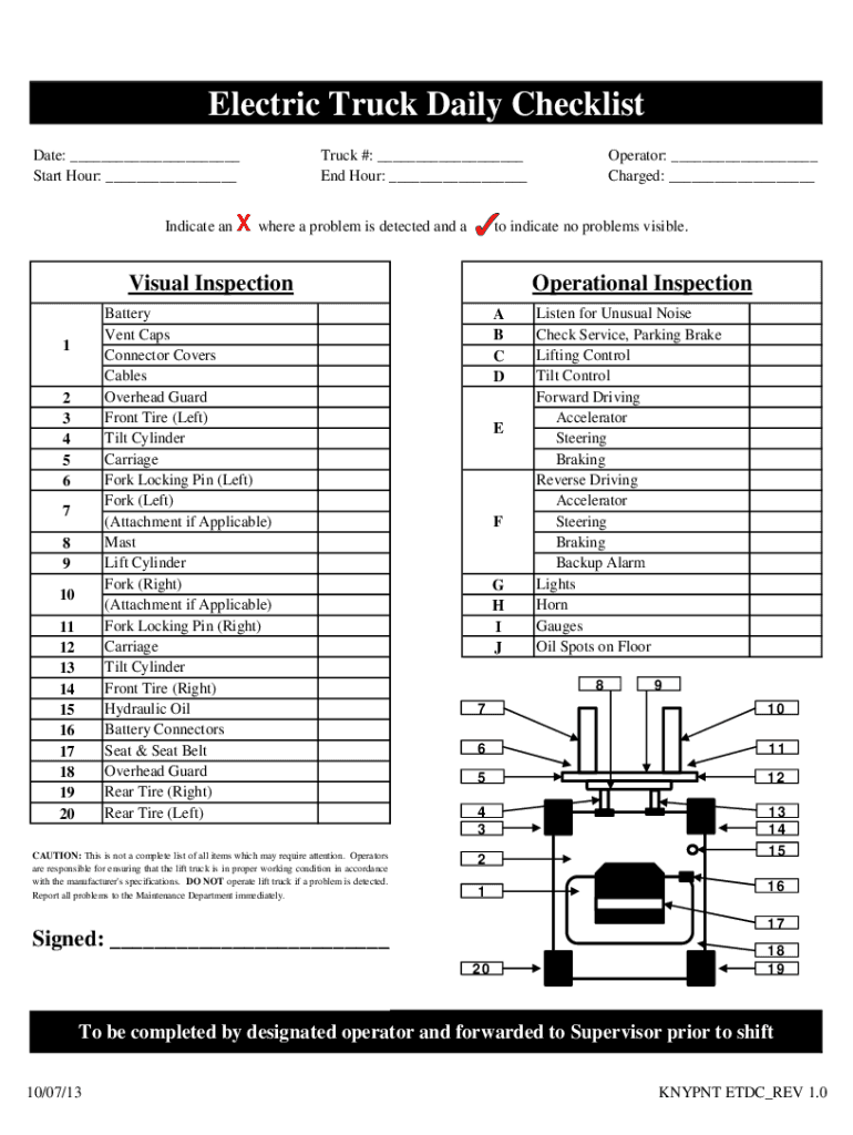Electric Truck Daily Checklist Date: ___ Start Hour: ___Truck #: ___ End Hour: ___Indicate an X where a problem is detected and ATO indicate no problems visible. Visual Inspection Battery Vent Caps