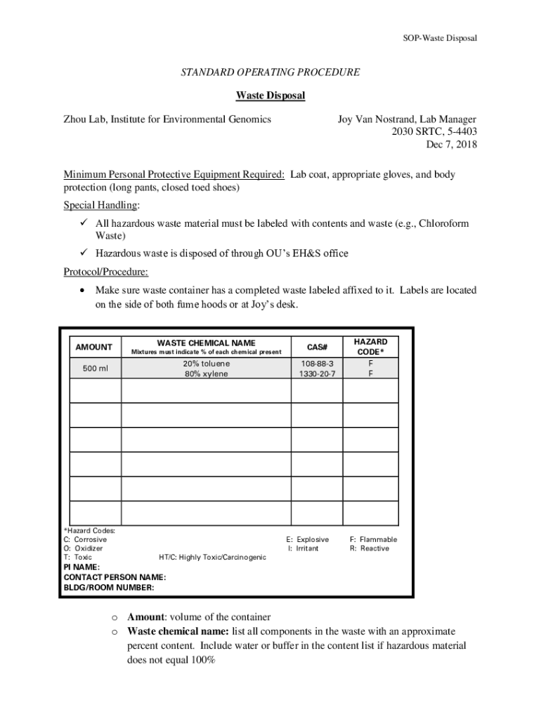 Waste DisposalSTANDARD OPERATING PROCEDURE Waste Disposal Zhou Lab, Institute for Environmental Genomics Joy Van No strand, Lab Manager 2030 SRC, 54403 Dec 7, 2018Minimum Personal Protective Equipment
