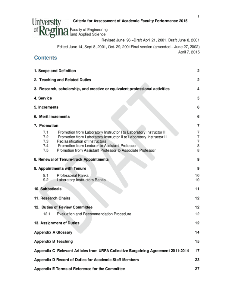 1 Criteria for Assessment of Academic Faculty Performance 2015 Faculty of Engineering and Applied Science Revised June 96 Draft April 21, 2001, Draft June 8, 2001, Edited June 14, Sept 8, 2001, Oct.