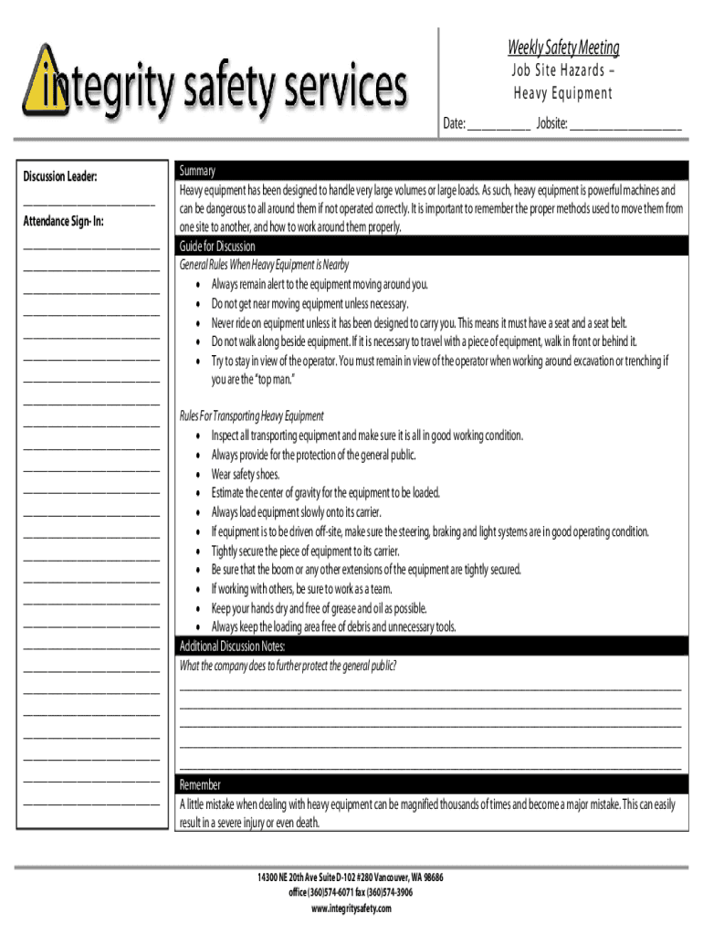Weekly Safety Meeting Job Site Hazards Heavy Equipment Date: ___ Job site: ___ Discussion Leader:___ Attendance Sign In:___ ___ ___ ___ ___ ___ ___ ___ ___ ___ ___ ___ ___ ___ ___ ___ ___ ___ ___
