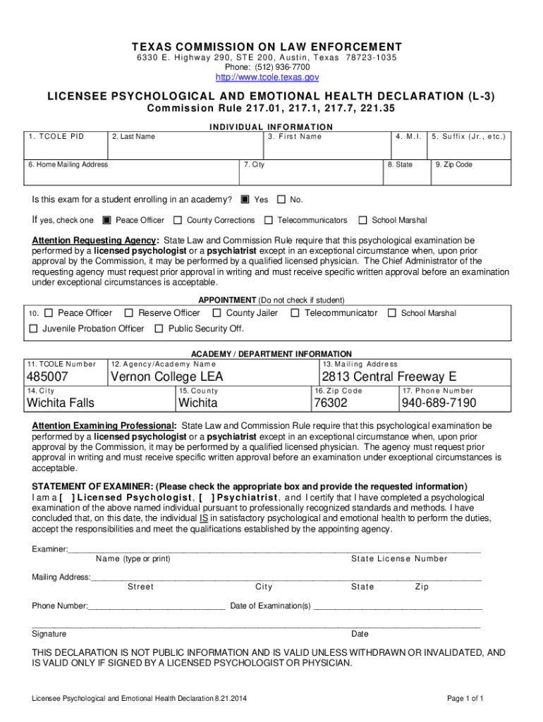 TEXAS COMMISSION ON LAW ENFORCEMENT 6 3 3 0 E. H i g h way 2 9 0, S T E 2 0 0, A u s t i n, T e × an s 7 8 7 2 3 1 0 3 5 Phone: (512) 9367700http://www.tcole.texas.govLICENSEE PSYCHOLOGICAL AND EMOTIONAL