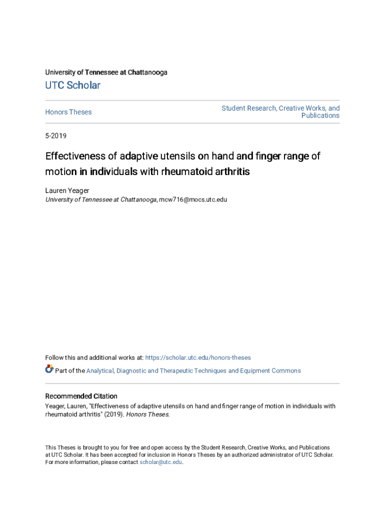University of Tennessee at Chattanooga UTC Scholar Honors ThesesStudent Research, Creative Works, and Publications52019Effectiveness of adaptive utensils on hand and finger range of motion in individuals