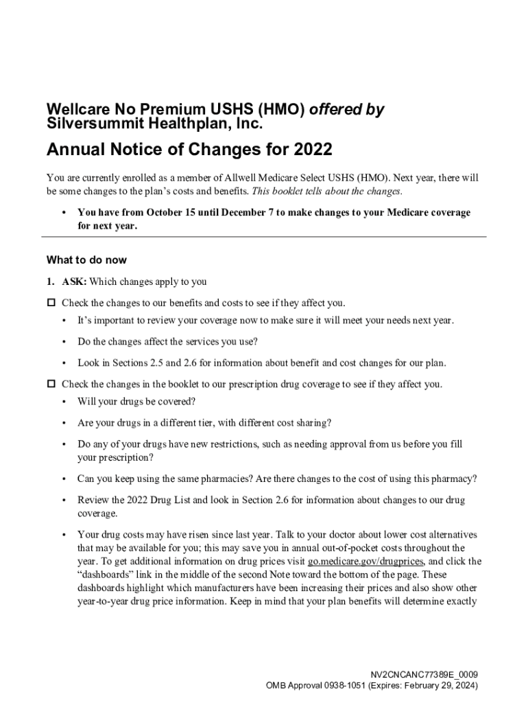 Well care No Premium USHS (HMO) offered by Silver summit Health plan, Inc. Annual Notice of Changes for 2022 You are currently enrolled as a member of All well Medicare Select USHS (HMO). Next year,