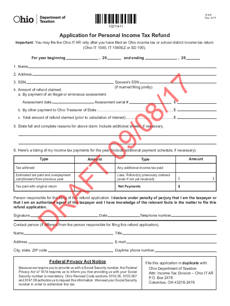IT AR Rev. 9/1710211411Application for Personal Income Tax Refund Important: You may file the Ohio IT AR only after you have filed an Ohio income tax or school district income tax return (Ohio IT