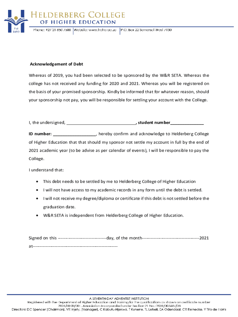 Acknowledgement of Debt Whereas of 2019, you had been selected to be sponsored by the W&R SET. Whereas the college has not received any funding for 2020 and 2021. Whereas you will be registered on