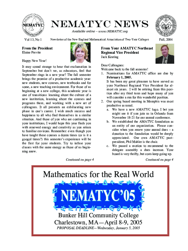 Available online www.NEMATYC.orgVol 13, No 1Newsletter of the New England Mathematical Association of Twofer CollegesFrom the Presidential, 2004From Your ALMATY Northeast