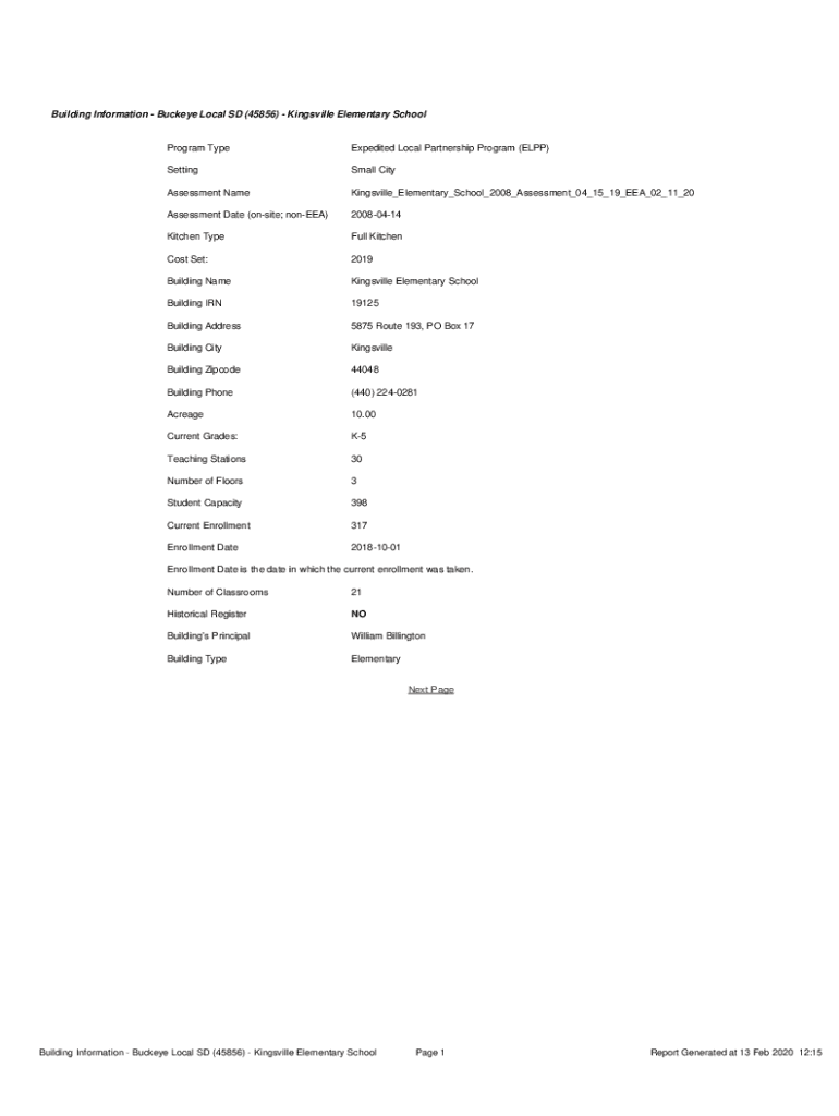 Building Information Buckeye Local SD (45856) Hinesville Elementary SchoolProgram TypeExpedited Local Partnership Program (EPP)Setting Small CityAssessment NameKingsville_Elementary_School_2008_Assessment_04_15_19_EEA_02_11_20Assessment