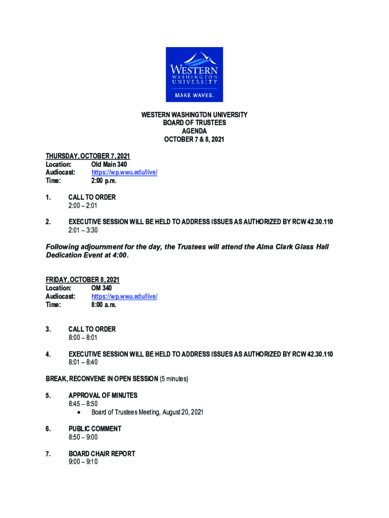 WESTERN WASHINGTON UNIVERSITY BOARD OF TRUSTEES AGENDA OCTOBER 7 & 8, 2021 THURSDAY, OCTOBER 7, 2021, Location: Old Main 340 Audio cast: https://wp.wwu.edu/live/ Time: 2:00 p.m. 1.CALL TO ORDER 2:00