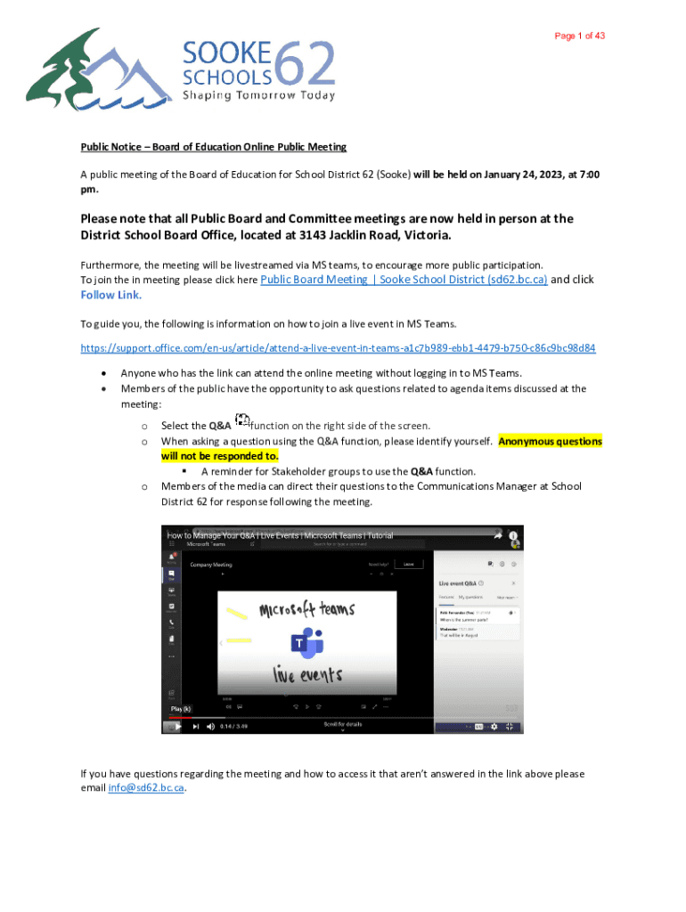 Page 1 of 43Public Notice Board of Education Online Public Meeting A public meeting of the Board of Education for School District 62 (Spoke) will be held on January 24, 2023, at 7:00 pm. Please note