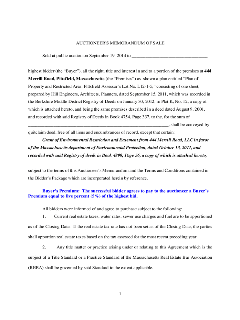 AUCTIONEER\'S MEMORANDUM OF SALE Sold at public auction on September 19, 2014, to ___ ___ the highest bidder (the Buyer), all the right, title and interest in and to a portion of the premises at 444