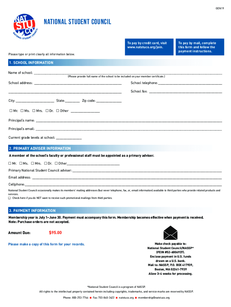 GEN19National Student Council To pay by credit card, visit www.natstuco.org/join. Please type or print clearly all information below. To pay by mail, complete this form and follow the payment instructions.1.