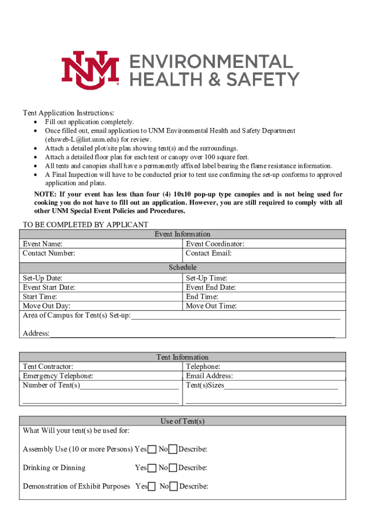 Tent and Temporary Membrane Structure ApplicationTent Application Instructions: Fill out application completely. Once filled out, email application to UNM Environmental Health and Safety Department