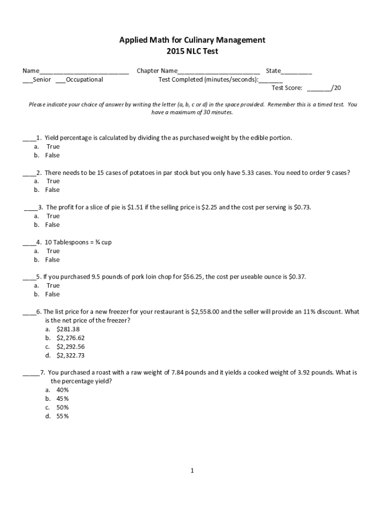 Applied Math for Culinary Management 2015 NFC Testate___ ___Senior ___OccupationalChapter Name___ State___ Test Completed (minutes/seconds):___ Test Score: ___/20Please indicate your choice of answer