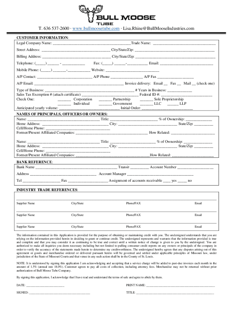 T. 636 5372600 www.bullmoosetube.com Lisa.Rhine@BullMooseIndustries.com CUSTOMER INFORMATION: Legal Company Name: ___Trade Name: ___ Street Address: ___ City/State/Zip: ___ Billing Address: ___ City/State/Zip: