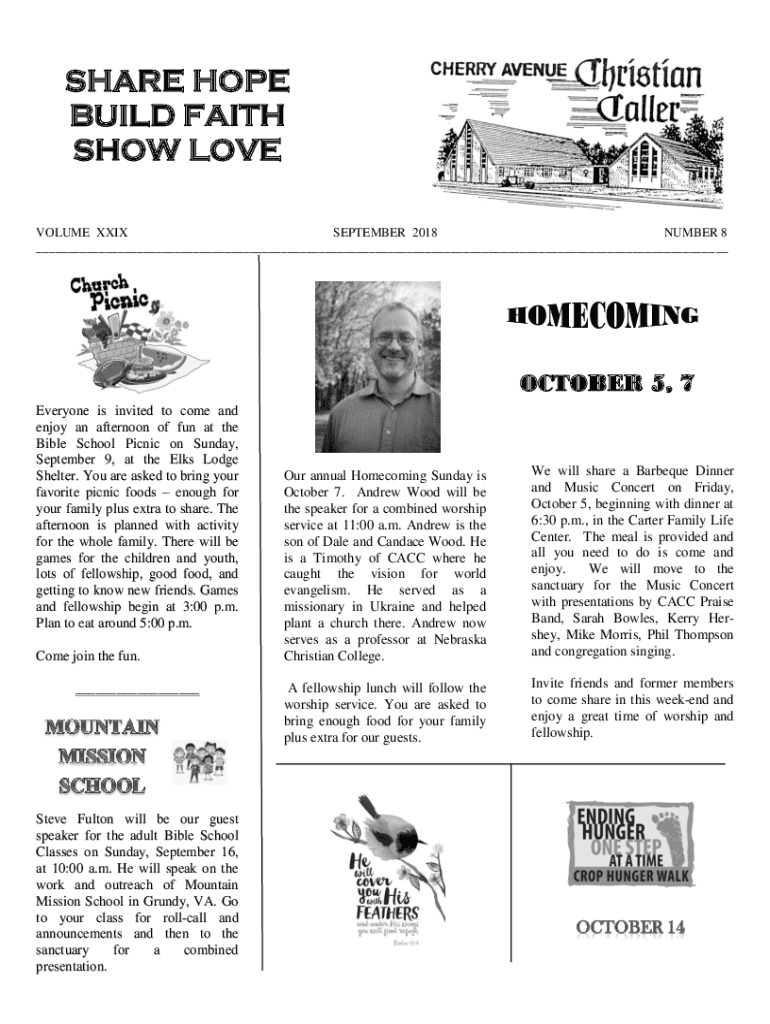 SHARE HOPE BUILD FAITH SHOW LOVE VOLUME XXIX SEPTEMBER 2018 NUMBER 8 ___OCTOBER 5, 7 Everyone is invited to come and enjoy an afternoon of fun at the Bible School Picnic on Sunday, September 9, at