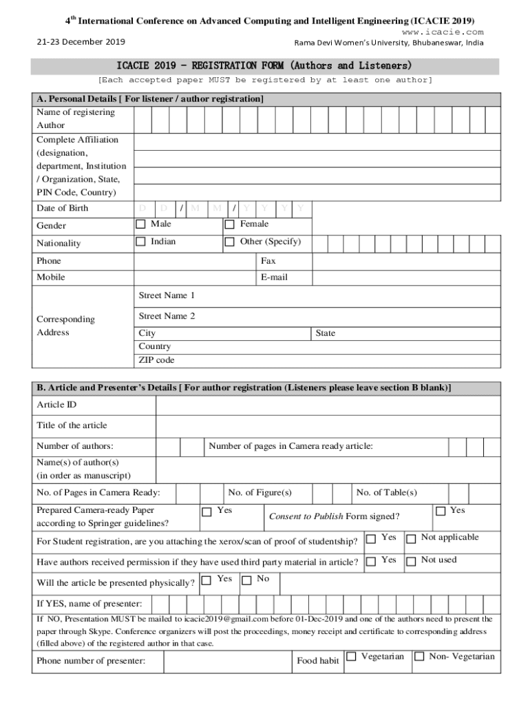 4th International Conference on Advanced Computing and Intelligent Engineering (ICA CIE 2019) www.icacie.com 2123 December 2019 Rama Devi Women's University, Bhubaneswar, Indelicacies 2019 REGISTRATION