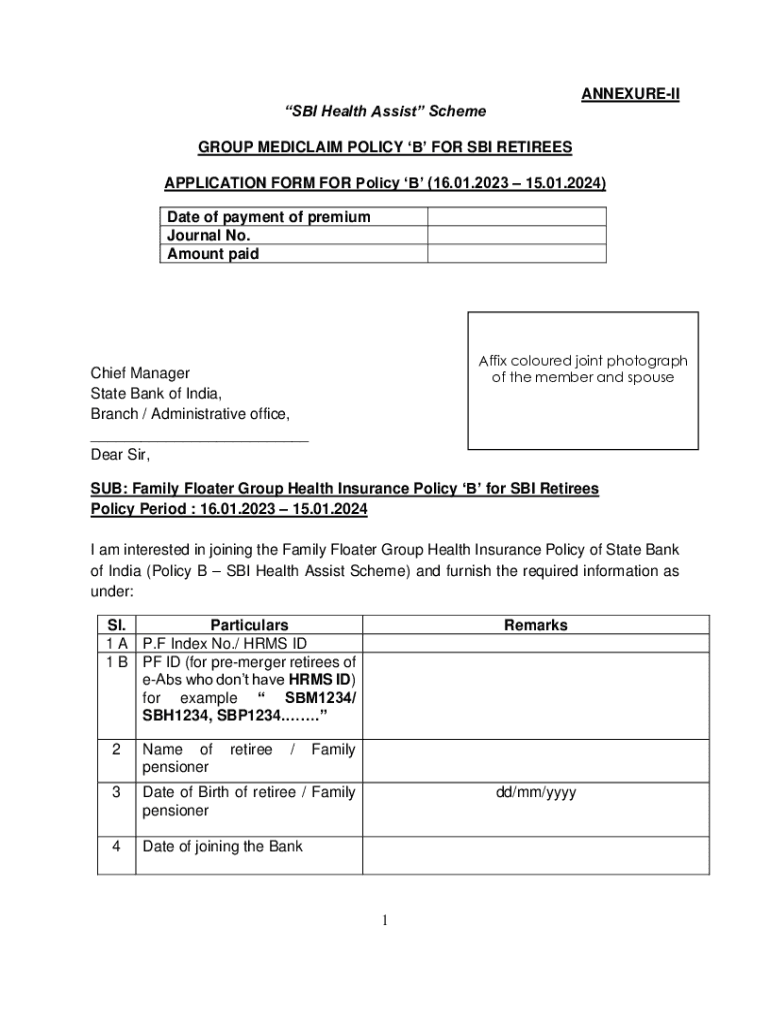 ANNEXUREII SBI Health Assist Scheme GROUP MEDICAID POLICY B FOR SBI RETIREES APPLICATION FORM FOR Policy B (16.01.2023 15.01.2024) Date of payment of premium Journal No. Amount paraffin colored joint