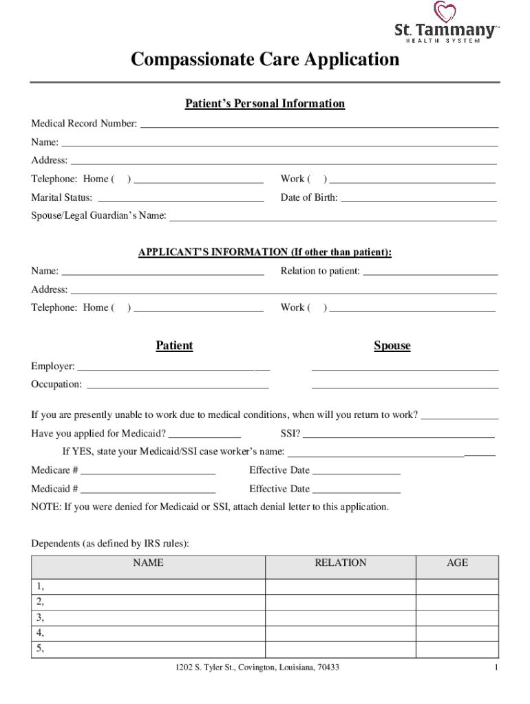 Compassionate Care Application Patients Personal Information Medical Record Number: ___ Name: ___ Address: ___ Telephone: Home () ___Marital Status: ___Work () ___Date of Birth: ___Spouse/Legal Guardians