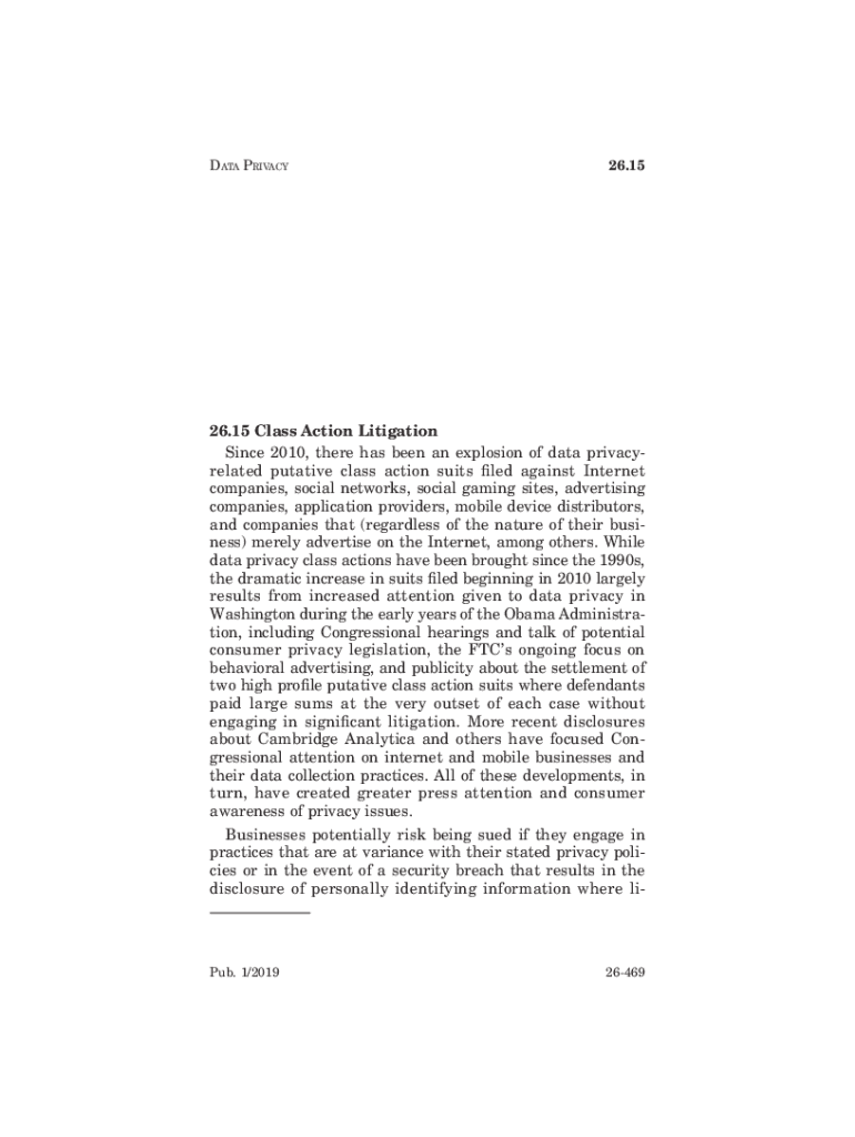 DEFENDING DATA PRIVACY CLASS ACTION LITIGATION Excerpted from Chapter 26 (Data Privacy) of e-commerce and Internet Law: Legal Treatise with Forms 2d Edition A 5volume legal treatise by Ian C. Ballot