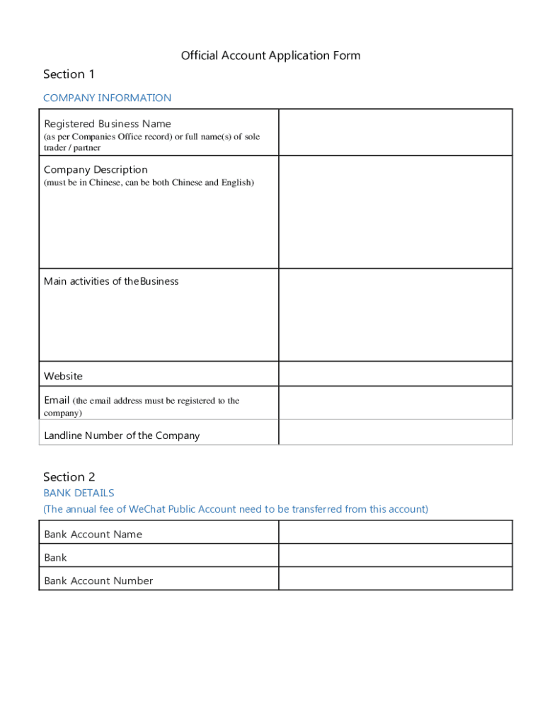 Official Account Application Form Section 1 COMPANY INFORMATION Registered Business Name (as per Companies Office record) or full name(s) of sole trader / partnerCompany Description (must be in Chinese,