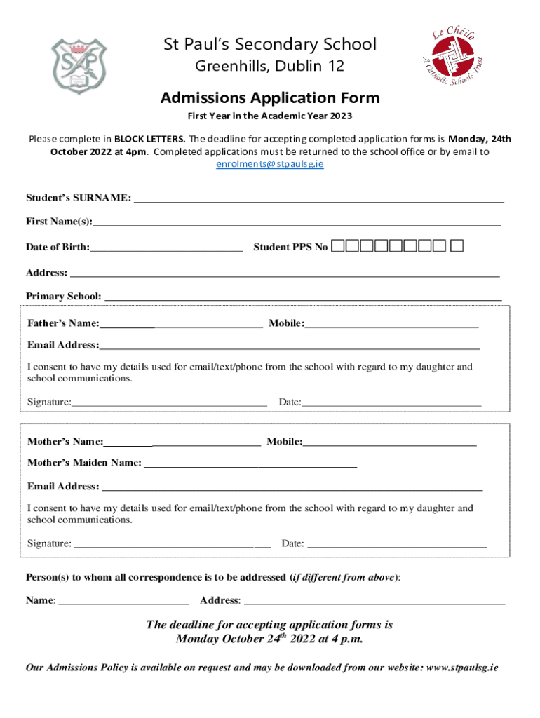 St Paul's Secondary School Green hills, Dublin 12Admissions Application Form First Year in the Academic Year 2023 Please complete in BLOCK LETTERS. The deadline for accepting completed application