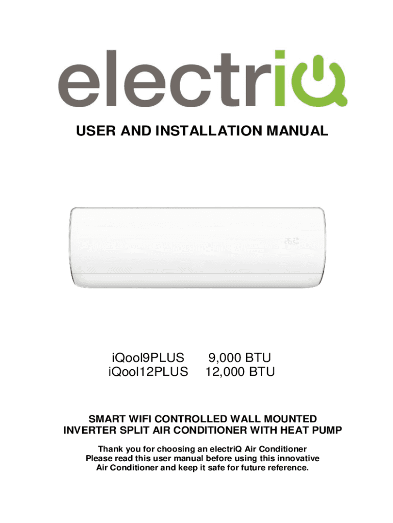 USER AND INSTALLATION MANUALiQool9PLUS iQool12PLUS9,000 BTU 12,000 BTU SMART Wi-Fi CONTROLLED WALL MOUNTED INVERTER SPLIT AIR CONDITIONER WITH HEAT PUMP Thank you for choosing an electric Air Conditioner