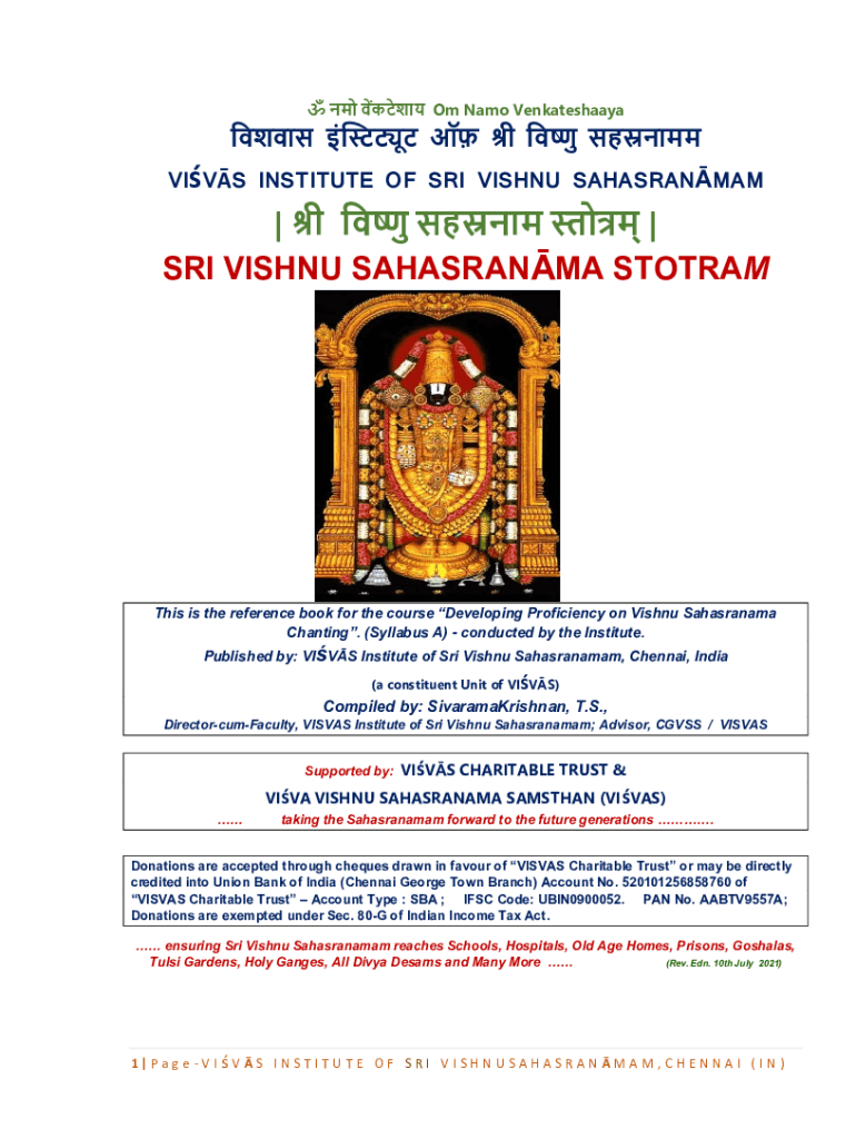 Om Name Venkateswara IVs INSTITUTE OF SRI VISHNU SAHASRANMAM| | SRI VISHNU SAHARAN STOTRAMThis is the reference book for the course Developing Proficiency on Vishnu Sahasranama Chanting. (Syllabus